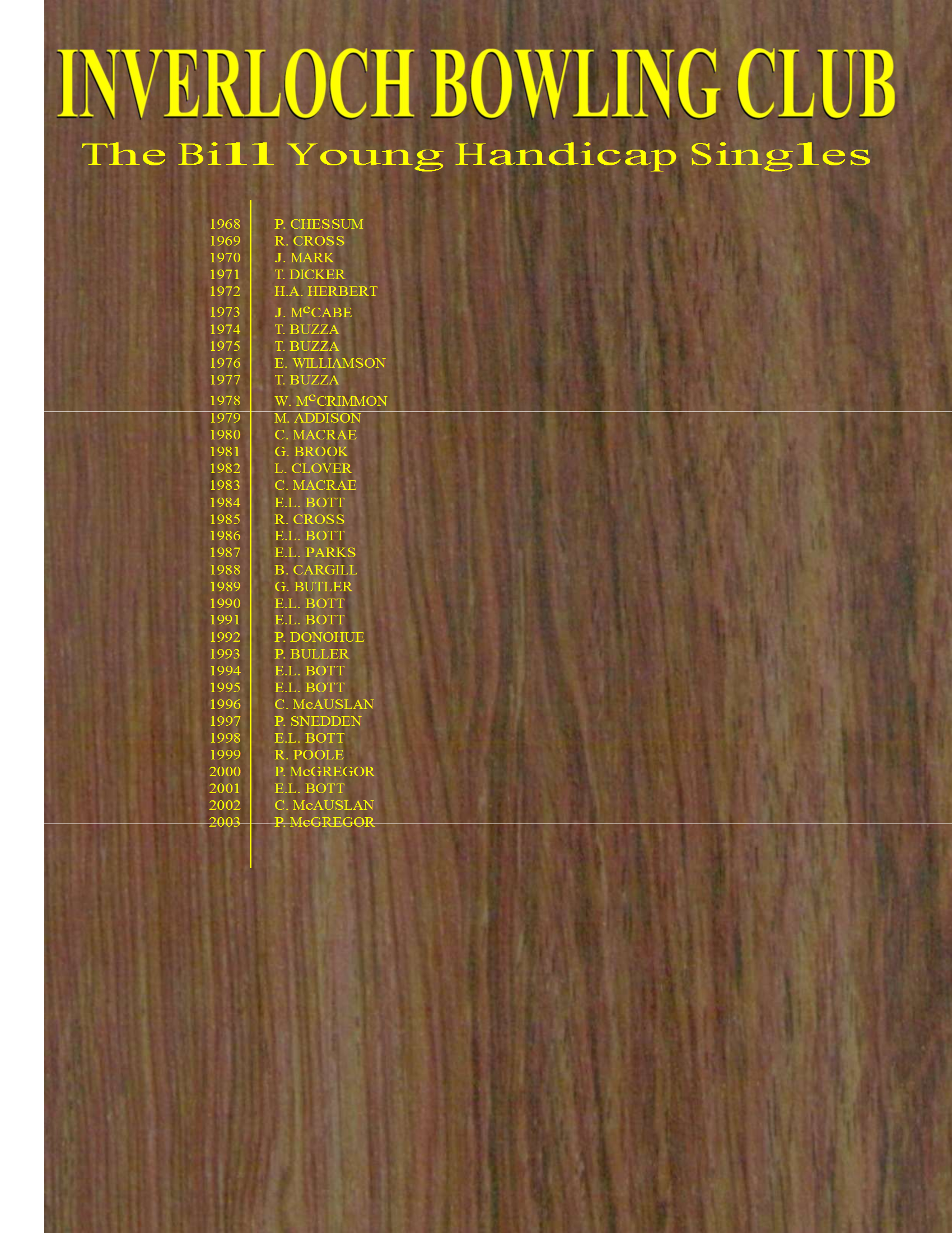 Ladies Achievements 2010-2024Men’s Achievements 2010-2016Bill Young Handicap Singles 1968-2003Office Bearers & Champions 2012-2026