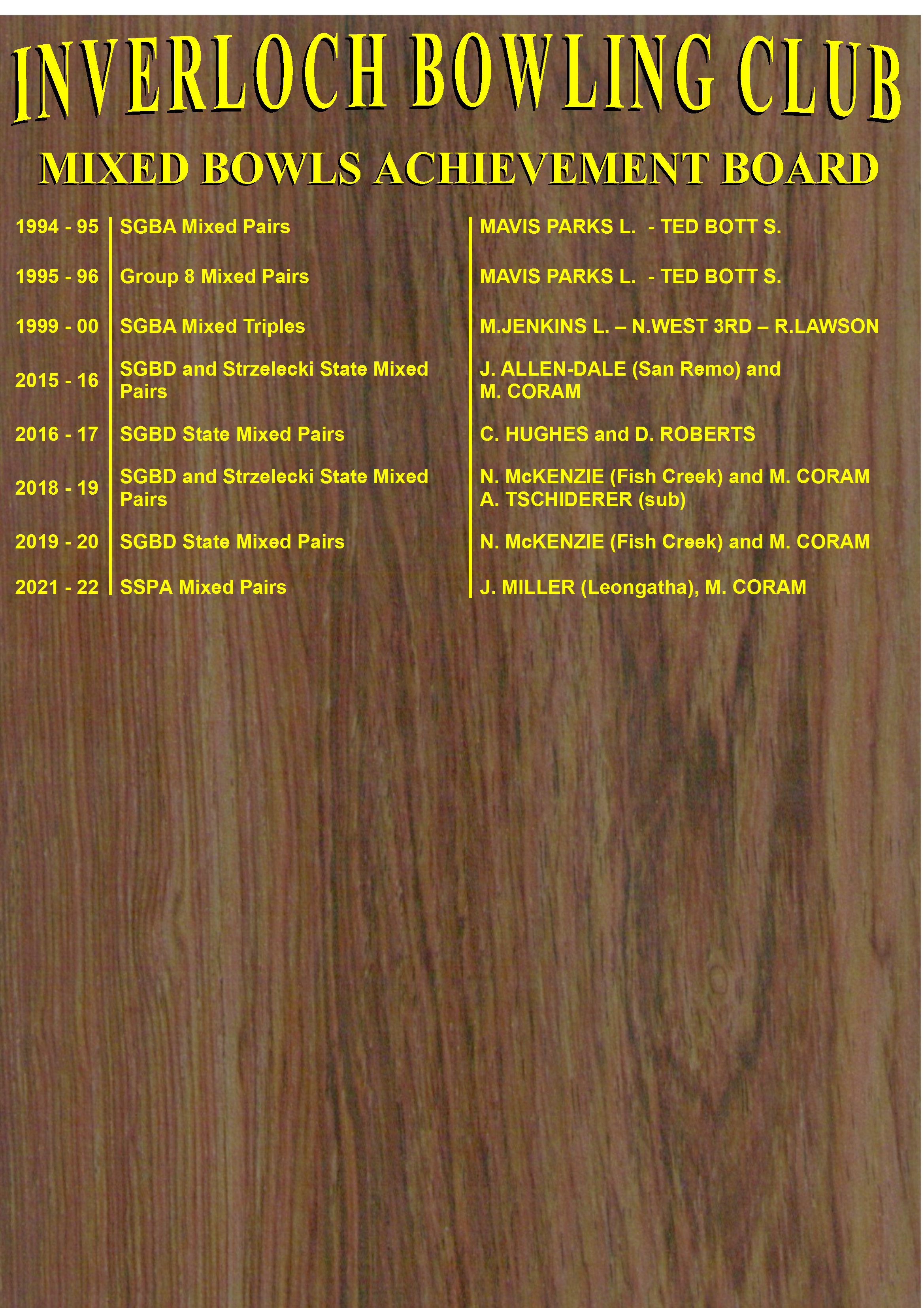 Ladies Achievements 1989-2011Men’s Achievements 2001-2010Mixed Pairs Champions 1961-2025Don Stoneham Indoor Bowls Trophy 1995-2012Treasurers 1960-2012
